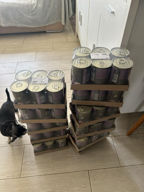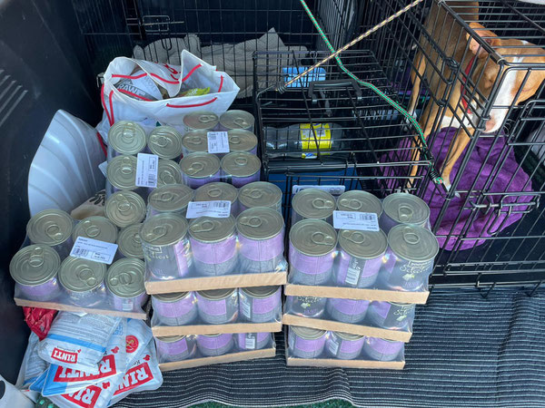 Bleiben wir in Andalusien. Dort hat Inge gerade Lucia von der Protectora La Luz de Laura besucht und ihr noch etwas Futter, das sie im Wohnmobil mit nach Spanien nehmen konnte gebracht. Viel ist es nicht, aber jede Dose zähl. Leider sind die erlaubten Zuladungen bei Wohnmobilen relativ gering und man kann - auf wenn es viel Platz gäbe, kaum etwas mitnehmen. Gerade schweres Futter bringt einen schnell in die Überladung, die teuer werden kann, wenn man erwischt wird.