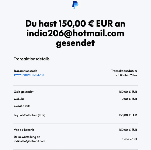 Heute konnte ich dank der erhaltenen Spenden Lucia 150,-- € für den Bau der Casa Coral schicken. Vielen lieben Dank an Euch.