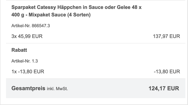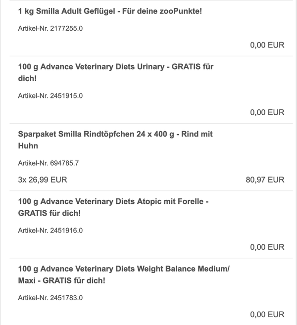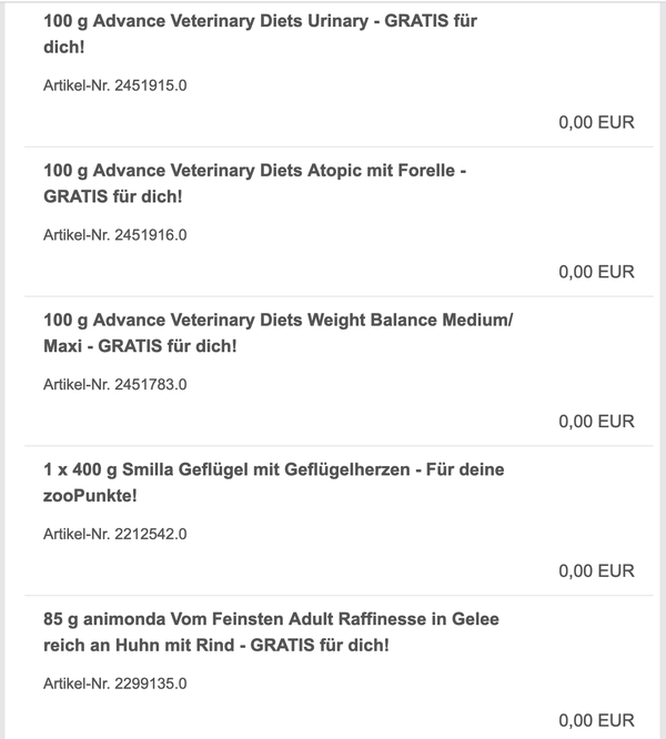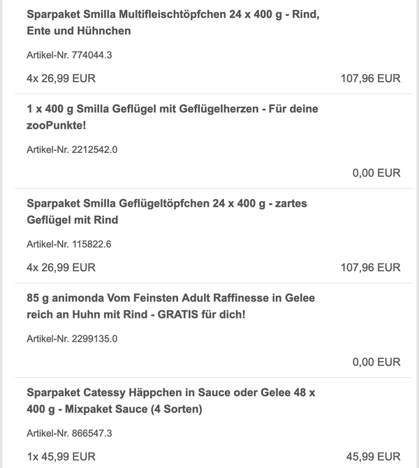 Logisch, dass ich auch bei dieser Bestellung alle Gratis-Produkte mit in den Warenkorb gelegt habe und die Bonuspunkte gegen Futter eingelöst habe.