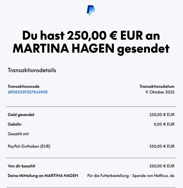 Ich bedanke mich ganz herzlich bei Christa H. und bei Rosi und Diana C., die neben den bereits gestern genannten Spendern mit ihren Spenden möglich gemacht haben, dass die Bestellung getätigt werden konnte.