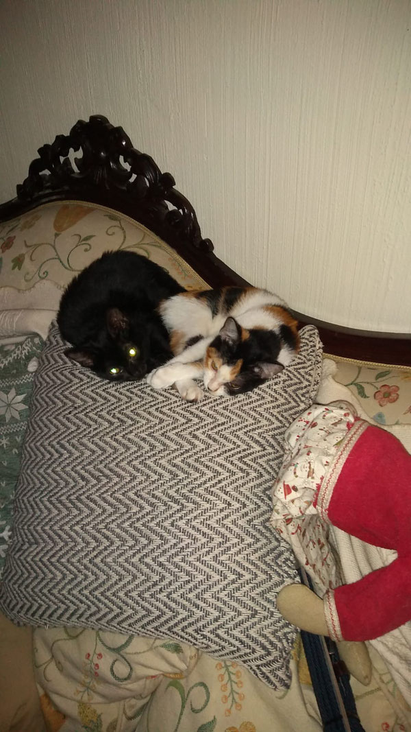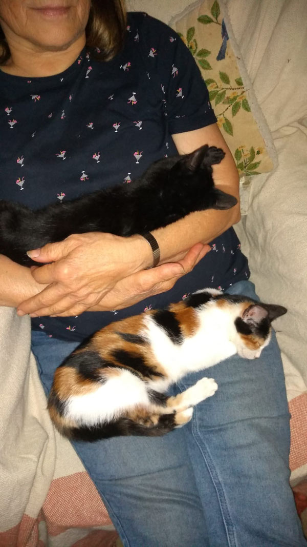 Sie sind, wie ihr wisst, bei Herrn Brüllhuber und seiner Lebensgefährtin untergekommen und genießen dort ein Leben, das sich wohl viele Streunerkatzen wünschen würden. Die Kleinen entwickeln sich prächtig, werden regelmäßig geimpft und leben mit im Haus. Abends schauen sie vom Schoß aus Fernsehen und sind bestimmt mittlerweile der deutschen Sprache mächtig. Sie kuscheln nicht nur gerne mit Frauchen sondern auch miteinander, was wieder einmal zeigt, dass man Katzen nicht alleine halten sollte.